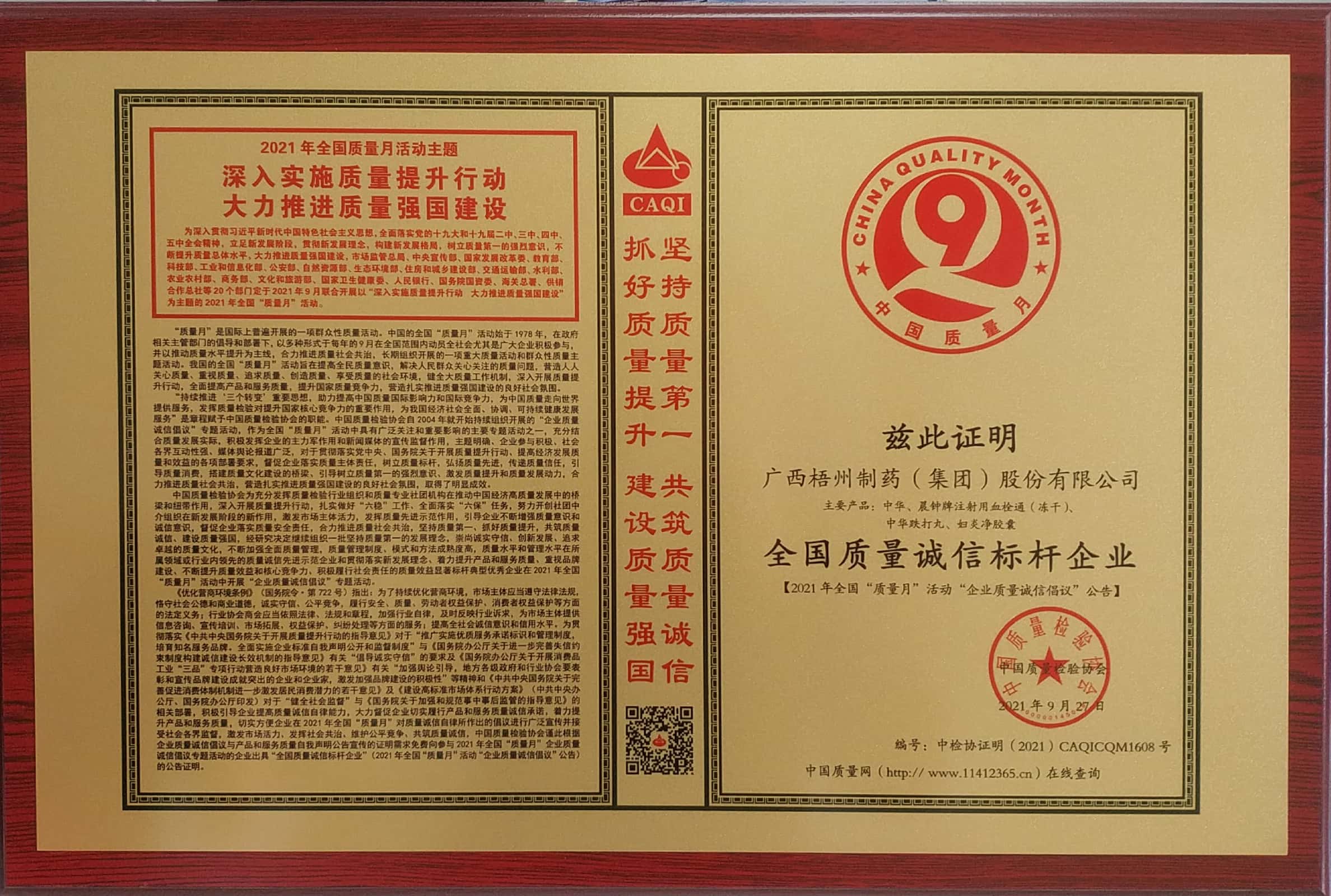 在2021年全國"質量月"活動中榮獲 全國質量誠信標桿 企業稱號。