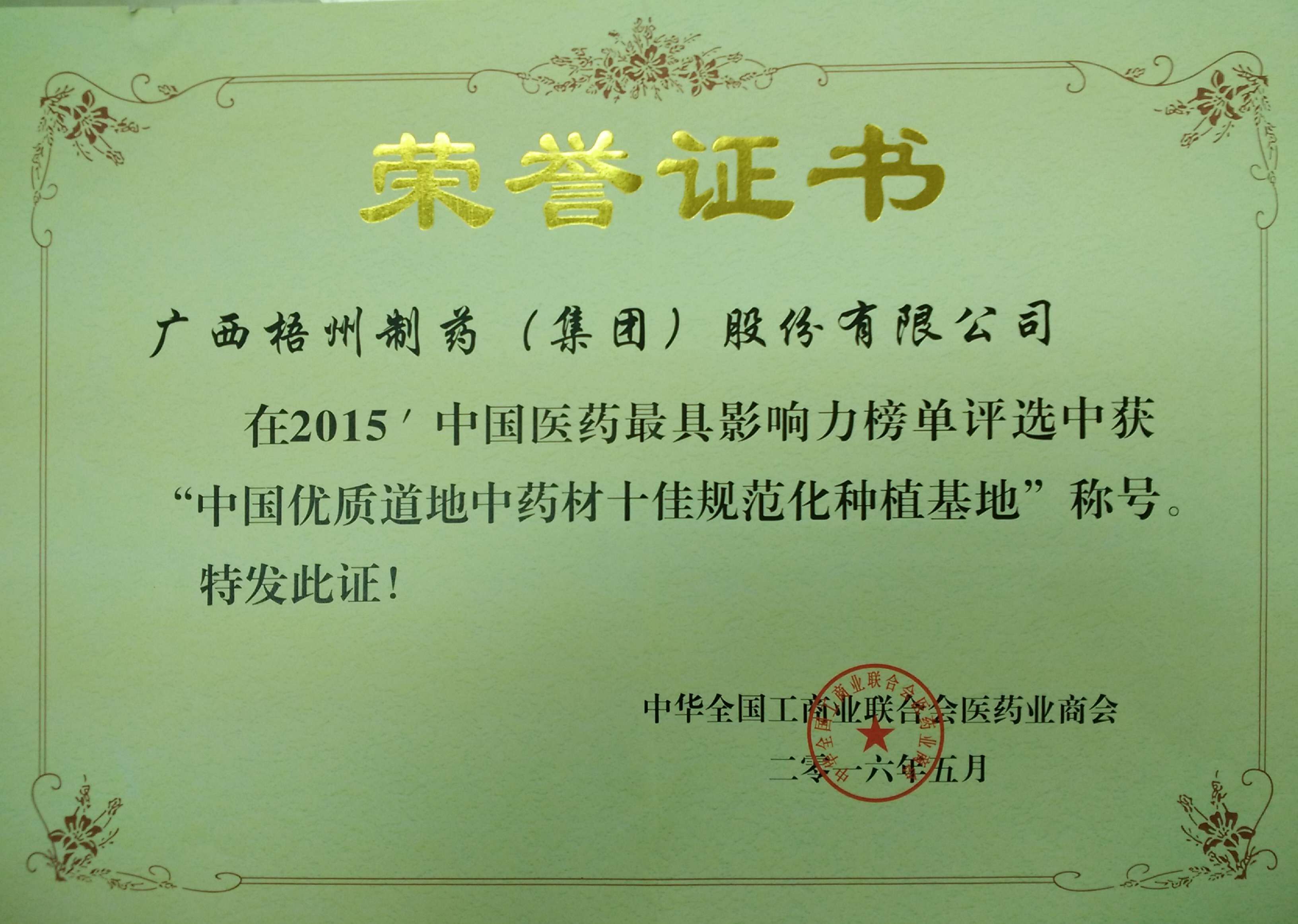 榮獲2015年度中國優質道地中藥材十佳規范化種植基地稱號