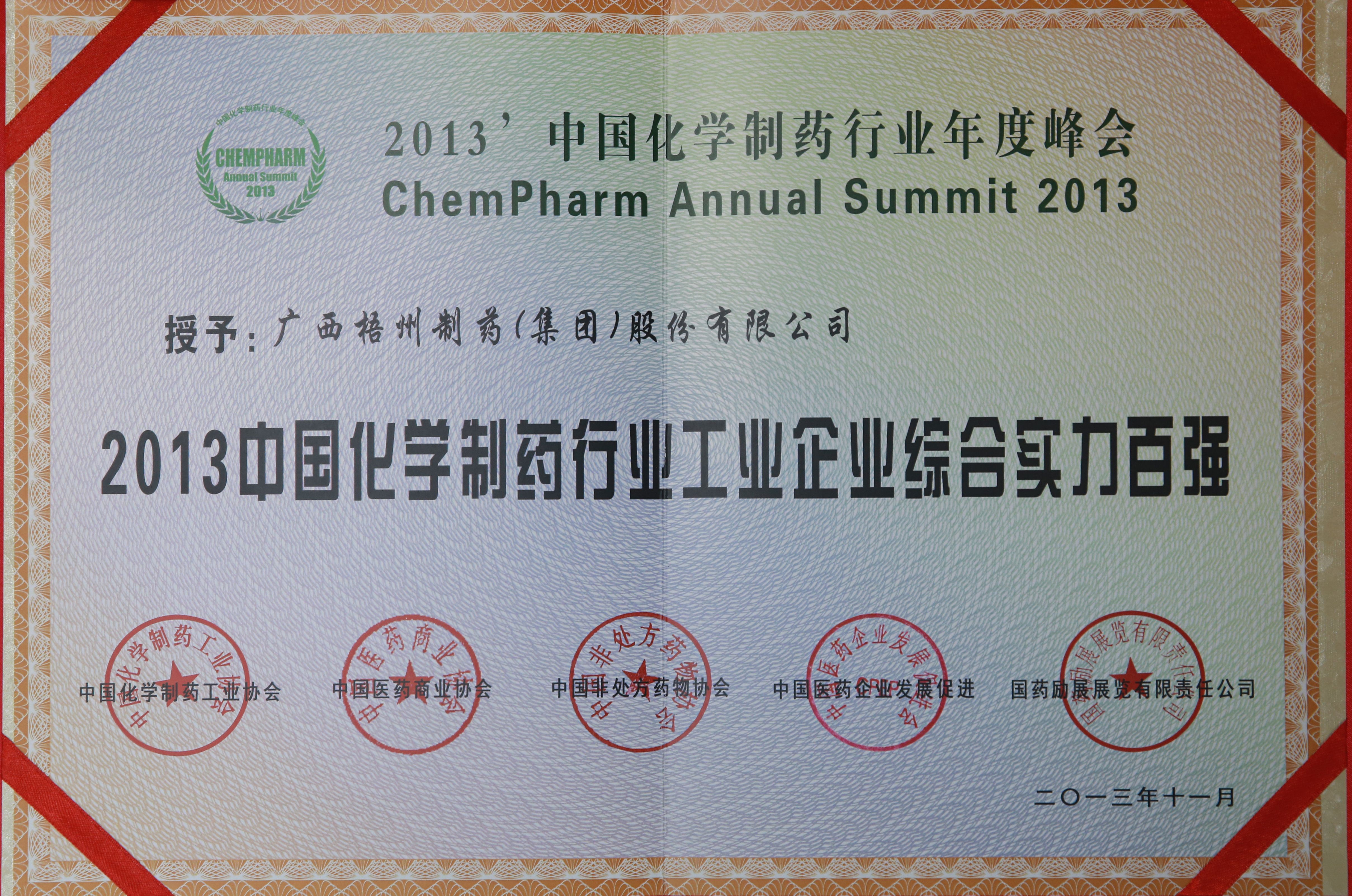 2013年度評選為中國化學制藥行業工業企業綜合實力百強