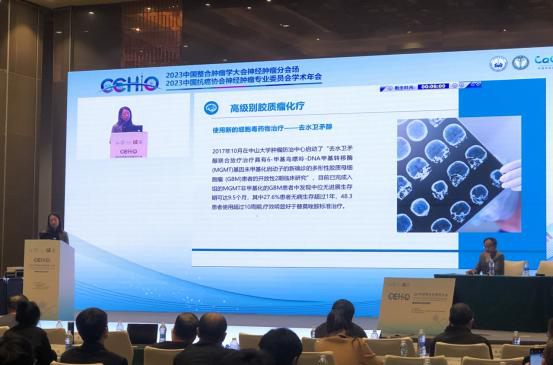會(huì)上,中山大學(xué)腫瘤防治中心郭琤琤教授為注射用去水衛(wèi)矛醇納入《膠質(zhì)瘤化療中國專家共識(shí)》進(jìn)行詳細(xì)的解讀。她表示,去水衛(wèi)矛醇主要作用機(jī)制是由-鳥嘌呤DNA烷化,具有不受MGMT影響,對(duì)膠質(zhì)瘤細(xì)胞增殖有較高抑制率,血腦屏障(BBB)通過率較高等優(yōu)點(diǎn)?!叭ニl(wèi)矛醇聯(lián)合放療治療具有-甲基鳥嘌呤-DNA甲基轉(zhuǎn)移酶 (MGMT)基因未甲基化啟動(dòng)子的新確診的多形性膠質(zhì)母細(xì)胞瘤 (GBM)患者的開放性2期臨床研究”項(xiàng)目顯示:MGMT非甲基化的GBM患者中發(fā)現(xiàn)中位無進(jìn)展生存期可達(dá)9.5個(gè)月,其中27.6%患者無病生存超過1年,48.3%患者使用超過10周期。為醫(yī)師在臨床應(yīng)用中提供更多的依據(jù),有機(jī)會(huì)提高M(jìn)GMT非甲基化的膠質(zhì)瘤患者療效,增加患者生存獲益。