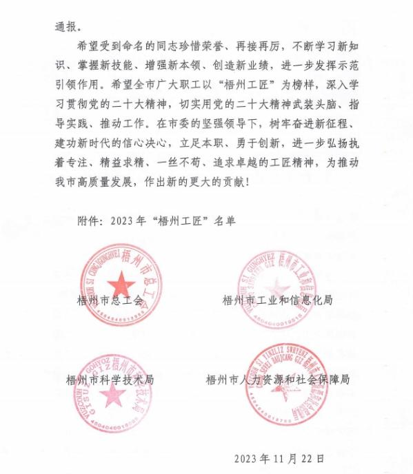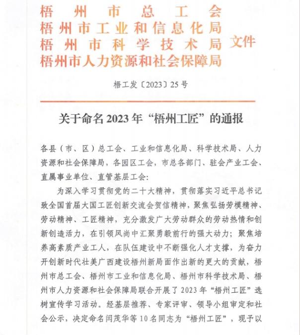 近日,梧州市總工會、梧州市工業(yè)和信息化局、梧州市科學(xué)技術(shù)局、梧州市人力資源和社會保障局聯(lián)合發(fā)布《關(guān)于命名2023年“梧州工匠”的通報》,梧州市有10名同志被選樹為“梧州工匠”,其中,梧州制藥固體車間化吳純芬獲此殊榮。