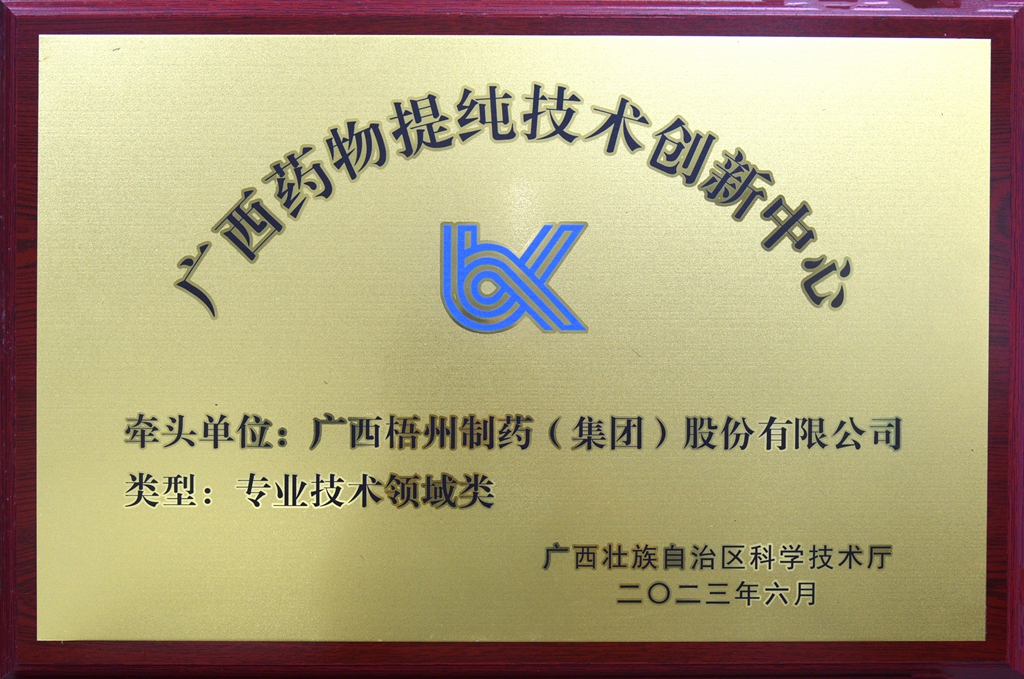 廣西梧州制藥(集團)股份有限公司在專業技術領域類獲評廣西藥物提純技術創新中心